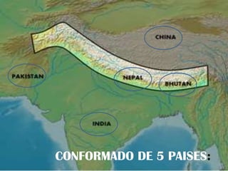 Este documento proporciona información sobre las cordilleras del Himalaya. Menciona que se extienden por 2600 km a través de 5 países, con una anchura de 350 km. Las 14 cimas más altas superan los 8000 metros, incluido el Monte Everest de 8848 metros en Nepal/China. Los glaciares de los Himalayas son importantes como fuente de los ríos en los que dependen cientos de millones de personas.