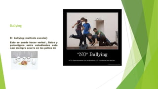El documento habla sobre el bullying o acoso escolar. Explica que puede ser verbal, físico o psicológico y ocurre principalmente en los patios de recreo. También menciona que el acoso escolar puede causar consecuencias biológicas y problemas de salud mental a largo plazo para las víctimas. Finalmente, identifica algunas de las causas comunes del acoso escolar, incluyendo características del agresor, el entorno escolar y la influencia de la televisión.