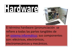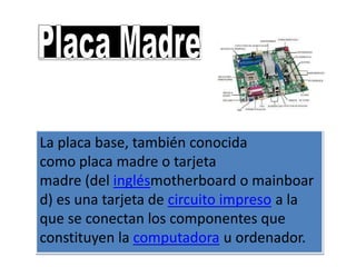 El documento describe los principales componentes de hardware de un sistema informático, incluyendo la placa base a la que se conectan otros componentes, la memoria de acceso aleatorio (RAM) que se utiliza como memoria de trabajo temporal, la memoria de solo lectura (ROM) que permite sólo la lectura de información de forma permanente, y el microprocesador que actúa como el "cerebro" central del sistema.