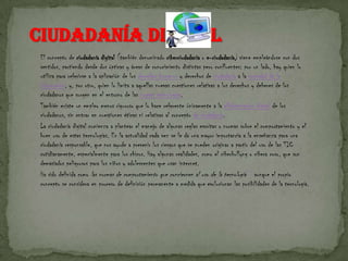 La ciudadanía digital se refiere a la aplicación de los derechos humanos y derechos de ciudadanía a la sociedad de la información, así como a las nuevas cuestiones relativas a los derechos y deberes de los ciudadanos que surgen en el entorno de las nuevas tecnologías. También incluye normas de comportamiento sobre el uso de la tecnología. Se le da mayor importancia a la enseñanza para una ciudadanía responsable que ayude a prevenir riesgos del uso de las TIC, especialmente para niños. El e-Learning es