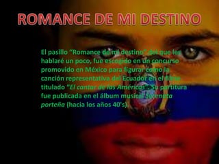 El pasillo "Romance de mi destino" fue seleccionado para representar al Ecuador en la película "El cantar de las Américas". La letra fue escrita por el poeta Abel Romeo Castillo y la música compuesta por Gonzalo Vera Santos. Aunque se cree que fue creado a finales de los años 30, se hizo popular durante el conflicto con Perú en 1941 y continúa siendo muy escuchado hoy en día.