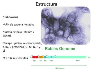 El virus de la rabia es un rhabdovirus con ARN de cadena negativa y forma de bala. Se replica en las células nerviosas y se transmite a humanos a través de mordeduras de animales infectados como perros, gatos y murciélagos. Los síntomas incluyen fiebre, espasmos y finalmente hidrofobia y parálisis. El diagnóstico se realiza mediante pruebas de fluorescencia o inoculación en ratones. La vacunación post-exposición y la inmunoglobulina humana son efectivas para la pro
