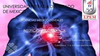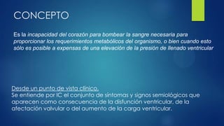 Este documento trata sobre la insuficiencia cardíaca. Define la insuficiencia cardíaca como la incapacidad del corazón para bombear suficiente sangre para satisfacer las necesidades metabólicas del organismo. Explica que las causas más comunes son las cardiopatías isquémicas y las valvulopatías. Describe los grados de insuficiencia cardíaca y el tratamiento, el cual se enfoca en aliviar los síntomas y mantener un volumen sanguíneo normal mediante el uso de diuréticos, vasodilatadores y otros medic