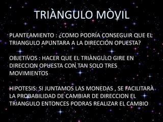 Este documento describe un experimento para cambiar la dirección de un triángulo formado por monedas usando solo tres movimientos. La hipótesis era que juntar las monedas facilitaría el cambio de dirección del triángulo. Los resultados mostraron que al juntar y mover las monedas de los extremos se podía formar el triángulo en la dirección opuesta, validando la hipótesis.