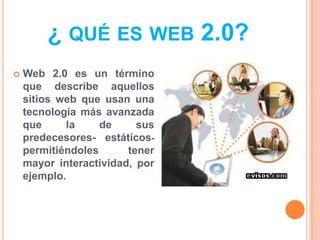 El documento aborda el concepto de Web 2.0, que se refiere a sitios web más interactivos en comparación con la Web 1.0, que eran estáticos y requerían conocimientos técnicos para su uso. Se destaca que la Web 2.0 permite a los usuarios contribuir a la creación de contenido y facilita la actualización de los sitios desde cualquier computadora. Además, se menciona la importancia de la interconectividad en estas plataformas.