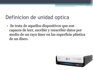 Este documento define las unidades ópticas como dispositivos que pueden leer, escribir y reescribir datos mediante un rayo láser en la superficie plástica de un disco. Luego enumera diferentes tipos de unidades ópticas e identifica sus partes clave como el camino óptico con láser, lente y fotodiodos, así como los mecanismos de rotación y carga de discos. Finalmente, describe los tipos de interfaz y las velocidades de grabación de estas unidades.