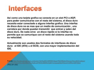 Las interfaces de disco duro, como IDE o SCSI, funcionan como una carretera que permite la comunicación entre el disco duro y el resto del sistema. Un disco duro rápido no puede aprovechar toda su velocidad si su interfaz no permite transmitir datos a la misma velocidad. Actualmente los formatos de interfaz más usados son IDE e SCSI, siendo IDE el más implementado.