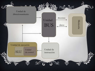 La CPU está compuesta por una unidad de control, una unidad aritmética lógica (ALU), una unidad de direccionamiento y una unidad de instrucción. Estas unidades trabajan juntas para leer instrucciones y datos de la memoria, dirigir las operaciones de la ALU y escribir los resultados de vuelta a la memoria a través del BUS.
