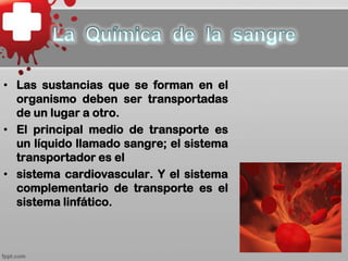 El documento describe el sistema de transporte de sustancias en el cuerpo a través de la sangre y el sistema cardiovascular. La sangre transporta oxígeno, nutrientes, dióxido de carbono y desechos a través del cuerpo, y ayuda a regular la temperatura y el pH. Existen cuatro tipos principales de sangre basados en los antígenos presentes en los glóbulos rojos.