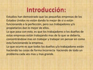 El documento discute tres puntos clave sobre el éxito de las pequeñas empresas. Primero, explica que a menudo los dueños y trabajadores se enfocan demasiado en el trabajo y no en mejorar el funcionamiento de la empresa. Segundo, señala que el origen de una empresa depende poco de las aspiraciones del emprendedor. Tercero, resalta que para que una empresa prospere, tanto su personal como su forma de trabajar deben cambiar de manera responsable y constante.