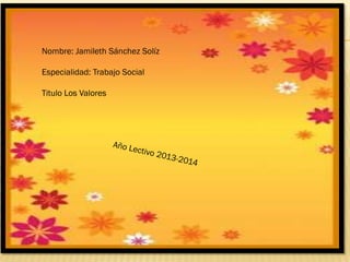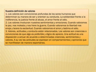 Este documento describe la definición de valores y los tipos de valores. Define los valores como convicciones profundas que determinan la forma de ser de las personas y guían su comportamiento. Explica que los valores involucran sentimientos y emociones, y están relacionados con las actitudes y la conducta. Finalmente, identifica tres tipos de valores: valores personales, valores familiares y valores socio-culturales.