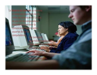 La historia de Internet se remonta al temprano desarrollo de las redes de comunicación y la idea de una red de computadoras diseñada para permitir la comunicación entre usuarios. Tim Berners-Lee comenzó el diseño de la World Wide Web (WWW) en el CERN para el intercambio de información entre científicos, basándose en el hipertexto y el protocolo HTTP. Hoy en día, la infraestructura de Internet se ha esparcido por el mundo para crear una red mundial de computadoras que proporciona acceso mundial sin precedentes a la