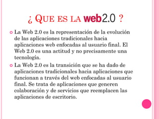 La Web 2.0 representa la evolución de las aplicaciones tradicionales a aplicaciones enfocadas en el usuario final que fomentan la colaboración y reemplazan las aplicaciones de escritorio. El término surgió en 2004 cuando Dale Dougherty de O'Reilly Media lo utilizó para describir el renacimiento y evolución del internet, con nuevas aplicaciones y sitios que ofrecían funcionalidades sorprendentes.
