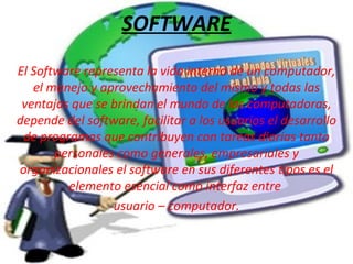 El documento describe diferentes tipos de software y hardware de computadoras. Explica que el software representa la vida interna de la computadora y que existen diferentes tipos como software libre, de sistema y de aplicación. También describe componentes hardware como la unidad central de procesamiento, memoria RAM, tarjetas de video y periféricos.