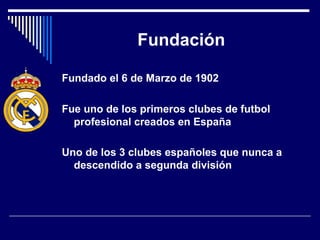 El documento resume la historia y logros del Real Madrid, uno de los clubes de fútbol más exitosos del mundo. Fundado en 1902, el Real Madrid ha ganado la Liga BBVA 32 veces, la Copa del Rey 18 veces y la Champions League en 9 ocasiones, siendo el primer equipo en ganar este torneo. Actualmente compite en la Liga BBVA, Copa del Rey y Champions League, y ha contado entre sus filas con grandes jugadores como Alfredo Di Stéfano, Zinedine Zidane y Cristiano Ronaldo.