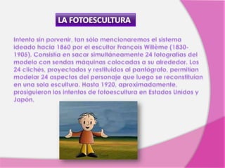 El documento describe brevemente el desarrollo de la fotografía a alta velocidad, desde las primeras cámaras capaces de exposiciones de 1/1000 de segundo hasta los avances en obturadores ultrarrápidos que permiten tiempos de hasta miles de millonésimas de segundo, lo que ha permitido fotografiar objetos en movimiento como balas. También se mencionan usos de la fotografía aérea, submarina, científica, médica y astronómica.
