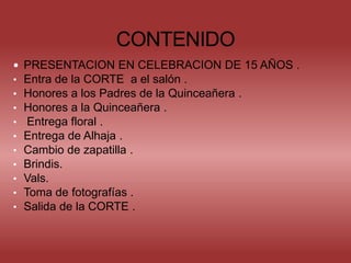 La ceremonia de celebración de 15 años incluye honores a los padres de la quinceañera y a la quinceañera, entrega de flores y joya, cambio de zapatillas, brindis, vals y toma de fotografías. La corte ingresa de forma ordenada para iniciar la ceremonia en homenaje a la quinceañera y sus padres.