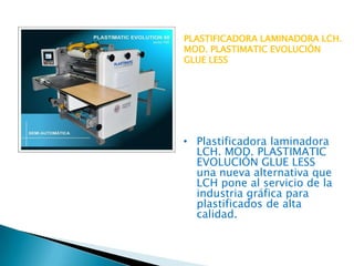 El documento describe varios modelos de plastificadoras y laminadoras de la marca LCH, incluyendo la Plastimatic Evolución que funciona con plásticos ecológicos sin pegamento, la Plastimatic Automática Mod. 5X 105 que es automática y más económica, la Plastimatic Manual que es estándar y funciona con todo tipo de plásticos, y la Plastimatic 52 que es bilateral y de formato mediano ideal para talleres pequeños.