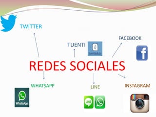 Este documento resume varias redes sociales y aplicaciones de mensajería populares como Twitter, Facebook, Tuenti, WhatsApp, Instagram y Line. Brevemente describe los orígenes, características y funcionalidades principales de cada plataforma.
