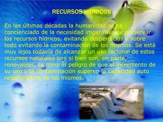 Este documento trata sobre los recursos hídricos en Nicaragua. Discute la necesidad de preservar el agua y evitar su contaminación. Explica que la disponibilidad de agua dulce varía mucho entre regiones. También cubre los usos del agua como riego, doméstico, hidroeléctrico e industrial en Nicaragua y la necesidad de tratar las aguas residuales para reducir la contaminación de los recursos hídricos. Concluye que los recursos naturales como el agua son fundamentales para la vida y deben ser cuid