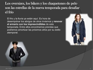 Los abrigos oversize, los bikers y los chaquetones de pelo son las tendencias principales para el invierno 2013-2014. Los abrigos oversize vienen en estampados como pata de gallo y animal print, pero son difíciles de combinar debido a su volumen; se recomienda usar prendas femeninas como faldas y vestidos para contrarrestar su estilo masculino. Los abrigos biker toman inspiración del estilo motero con cuero y cremalleras laterales, y muchos diseñadores los presentan en negro o en forma de capa. Los
