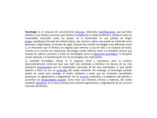 La tecnología se refiere al conjunto de conocimientos técnicos ordenados científicamente que permiten crear bienes y servicios para satisfacer las necesidades humanas y adaptarse al medio ambiente. Se origina de las palabras griegas "técnica" y "estudio". Influye en el progreso social y económico pero se orienta más a satisfacer los deseos de los más prósperos que las necesidades de los más necesitados, lo que puede no ser sostenible para el medio ambiente.