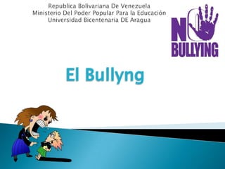Este documento describe el acoso escolar, incluyendo sus tipos (intimidación, agresiones, amenazas, hostigamiento y manipulación), cómo se desarrolla a través de cuatro etapas, e indicaciones de que un estudiante está siendo acosado. También ofrece recomendaciones para padres, víctimas, acosadores y espectadores, así como tipos de acosadores y factores como la educación familiar, medios de comunicación y sociedad que pueden contribuir al acoso escolar.