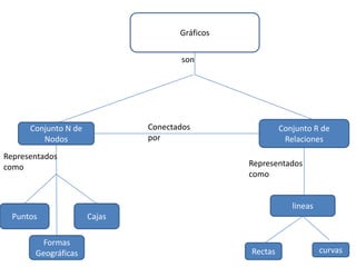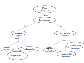 El documento describe un mapa conceptual, que es una estrategia de representación gráfica de conocimientos. Un mapa conceptual consiste en conceptos conectados por palabras de enlace y líneas, formando una jerarquía visual para simplificar la información. Los mapas conceptuales muestran relaciones entre conceptos de diferentes temas como biología, tecnología y educación.