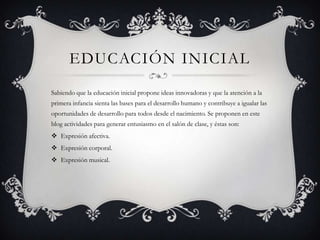 Este documento propone tres actividades para generar entusiasmo en el salón de clase de educación inicial: expresión afectiva, expresión corporal y expresión musical. La educación inicial es importante porque sienta las bases para el desarrollo humano y contribuye a igualar las oportunidades desde el nacimiento.