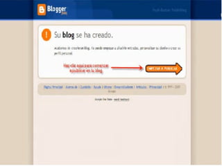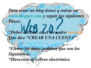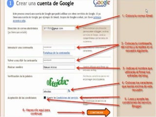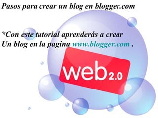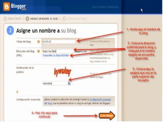 Este documento proporciona instrucciones en varios pasos para crear un blog en blogger.com. Primero, el usuario debe crear una cuenta ingresando su dirección de correo electrónico, contraseña y otros datos personales. Luego asigna un nombre y dirección URL al blog. Finalmente, selecciona una plantilla de diseño y comienza a publicar entradas de blog.