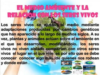 Este documento presenta información sobre los factores ambientales que afectan a los seres vivos y las interacciones entre ellos. Explica que los seres vivos se adaptan al medio ambiente y también lo modifican, y que comparten el hábitat con otras especies. Define factores abióticos como componentes ambientales como agua, temperatura, suelo y aire. También describe tipos de interacciones como mutualismo, comensalismo y competencia.