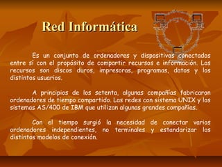 Este documento describe los diferentes tipos de redes informáticas. Explica que una red informática conecta ordenadores y dispositivos para compartir recursos e información. Luego describe los componentes básicos de una red como emisores, receptores e interfaces. Finalmente, clasifica las redes por su alcance, propiedad, método de conexión y relación funcional.
