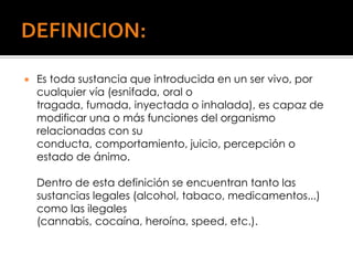 El documento define las drogas como sustancias que modifican las funciones del organismo cuando se introducen en un ser vivo. Describe drogas legales e ilegales, y clasifica las drogas en depresoras, estimulantes y perturbadoras del sistema nervioso central. Explica que el uso regular de drogas puede conducir a la tolerancia, la dependencia y el síndrome de abstinencia.