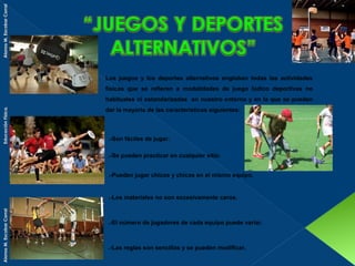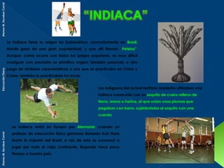 El documento describe la Indiaca, un juego alternativo originario de Brasil que se juega con una pelota con plumas. Explica las reglas básicas del juego, como el saque, los tres toques por equipo, la prohibición de tocar la red, y los puntos necesarios para ganar un set o partido. También proporciona detalles sobre el terreno de juego, número de jugadores y tipos de Indiacas.