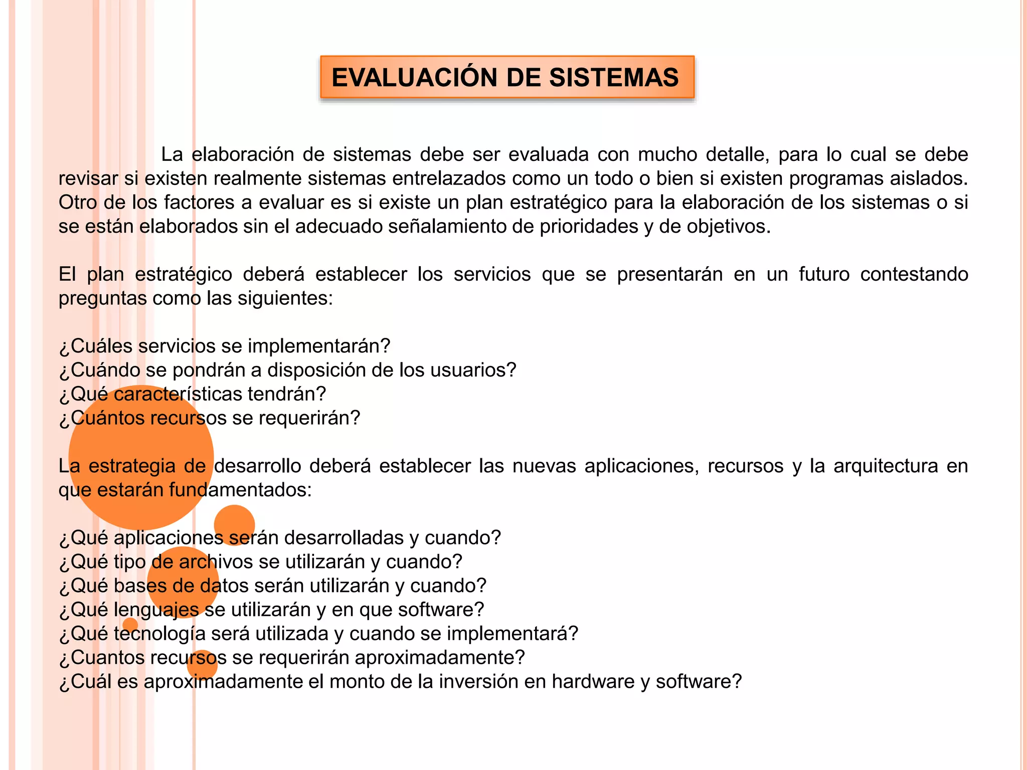 El documento describe los diferentes factores que deben evaluarse al evaluar sistemas de información. Estos incluyen si los sistemas están entrelazados o son programas aislados, si existe un plan estratégico, y si se han consultado a los usuarios. También señala que la evaluación debe seguir el ciclo de vida del sistema, incluyendo factibilidad, análisis, diseño lógico y desarrollo.