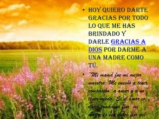 El documento rinde homenaje a las madres y su amor incondicional. Resalta que una madre es más que una mujer, es un ángel que sacrifica su tiempo y salud por el bienestar de sus hijos. Además, destaca que el amor de una madre es lo más maravilloso y que ser madre es uno de los puestos de trabajo más altos.