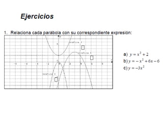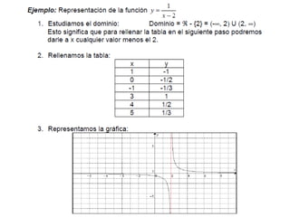 Este documento presenta un repaso de diferentes tipos de funciones elementales, incluyendo funciones afines cuya gráfica es una recta definida por una pendiente m y una ordenada en el origen n, funciones cuadráticas, funciones de proporcionalidad inversa, funciones radicales, funciones exponenciales y funciones logarítmicas. Cada tipo de función se define brevemente.