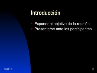 El documento presenta un plan para una reunión que incluye introducir el objetivo y a los participantes, discutir tres temas principales con detalles e información adicional, compartir ejemplos de la vida real, resumir los puntos clave y los pasos siguientes.
