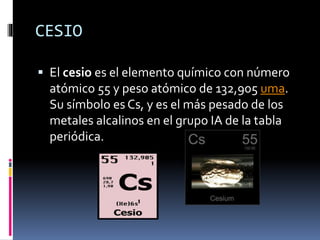 El documento proporciona información sobre tres elementos químicos: cesio, bario y lantano. El cesio es el metal alcalino más pesado, blando y de bajo punto de fusión que reacciona vigorosamente con el oxígeno y violentamente con el agua. El bario es un metal alcalinotérreo similar al calcio pero más reactivo que se oxida y reacciona con agua. El lantano es un elemento de la tabla periódica que se obtiene de minerales y se usa en vidrios ópticos, crisoles, espon