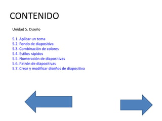 Este documento describe los diferentes elementos de diseño que se pueden aplicar a las diapositivas de una presentación en PowerPoint, como temas, fondos, combinaciones de colores, estilos rápidos, numeración, patrones y diseños personalizados. Explica cómo aplicar y modificar cada uno de estos elementos para dar formato y estructura a las diapositivas de una presentación.