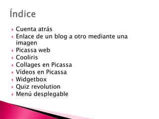 Este documento proporciona instrucciones para agregar varios elementos interactivos a un blog de Carnaval, incluyendo una cuenta regresiva, enlaces entre blogs mediante imágenes, álbumes de Picasa Web, presentaciones de fotos en 3D utilizando Cooliris, collages y videos de Picasa, widgets de video de Widgetbox, encuestas de Quiz Revolution y menús desplegables. También instruye crear un blog de Carnaval que incluya estas características junto con un nombre y cursor animados y una cuenta regresiva.