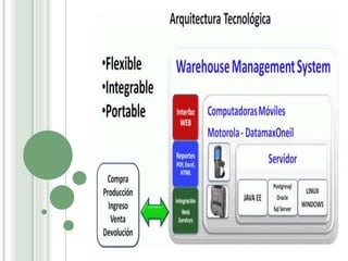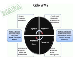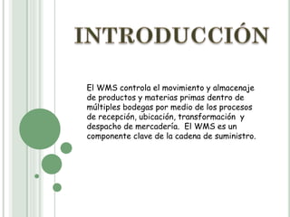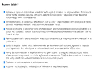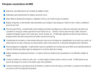 El WMS controla el movimiento y almacenaje de productos y materias primas dentro de múltiples bodegas mediante procesos como la recepción, ubicación, transformación y despacho de mercadería. El WMS mejora los niveles de servicio, utiliza los espacios y equipos de manera más eficiente, y sincroniza el almacén y la cadena de suministro en tiempo real.