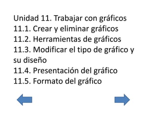 Este documento describe cómo crear, modificar y dar formato a gráficos en PowerPoint. Explica cómo insertar un gráfico, cambiar su tipo y diseño, y modificar sus elementos y presentación usando las herramientas de gráficos. También cubre cómo dar formato a elementos individuales de un gráfico.