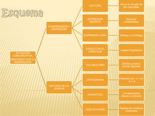 El documento presenta una lista de temas relacionados con el lenguaje y la comunicación que serán cubiertos, incluyendo situaciones comunicativas, comprensión y expresión de lectura y escritura, expresión oral, juegos con el lenguaje, estudio de la lengua con vocabulario y ortografía, gramática, y repaso de unidades anteriores.