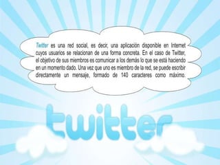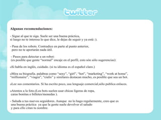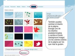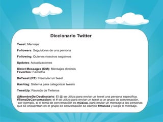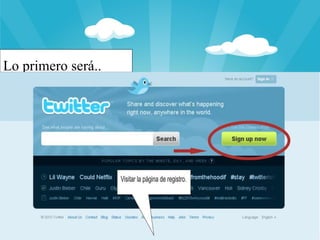 El documento proporciona instrucciones para crear una cuenta de Twitter e incluir amigos. Indica que se debe completar la información personal requerida como nombre, usuario, contraseña y correo electrónico, y luego hacer clic en "Create my account". También explica que se pueden añadir amigos buscándolos por nombre o usuario en Twitter, entre los contactos de correo electrónico, invitándolos por correo, añadiendo sugerencias de Twitter o siguiendo a usuarios directamente.