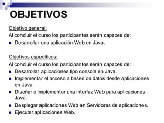 Este documento presenta los objetivos y contenidos de un curso de Java. Los objetivos generales incluyen desarrollar aplicaciones web en Java, mientras que los objetivos específicos incluyen desarrollar aplicaciones de consola, acceder a bases de datos, diseñar interfaces web y desplegar aplicaciones web en servidores. Los contenidos cubren fundamentos de Java, bases de datos, y desarrollo web con Java. Las estrategias didácticas incluyen discusión teórica, práctica guiada y estudios de caso.