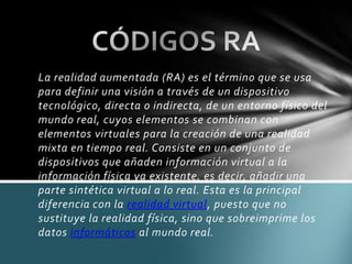 El documento define la realidad aumentada como una visión del mundo real a través de un dispositivo tecnológico que combina elementos virtuales con elementos físicos para crear una realidad mixta en tiempo real. Explica que la realidad aumentada añade información virtual a la información física existente en lugar de sustituir la realidad física. También describe algunas tecnologías como cámaras digitales y sensores que se usan en sistemas modernos de realidad aumentada.