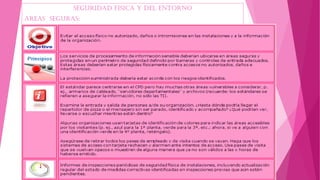 El documento habla sobre la seguridad física y del entorno en el área de seguridad de la información. Describe la importancia de establecer perímetros de seguridad física, controles de entrada, y protección de oficinas, despachos y recursos. También recomienda medidas de protección contra amenazas externas como incendios o inundaciones, y asegurar el equipamiento contra accesos no autorizados o fallas eléctricas.
