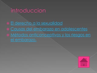 El documento habla sobre el embarazo adolescente, incluyendo el derecho a la sexualidad, las causas del embarazo en adolescentes como la falta de educación sexual, y los métodos anticonceptivos y riesgos del embarazo como la placenta previa y el parto prematuro.