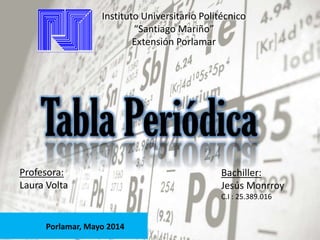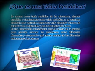 La tabla periódica clasifica los elementos químicos en grupos y períodos según sus propiedades periódicas recurrentes. John Newlands y Dimitri Mendeleev fueron pioneros en el desarrollo de las primeras tablas periódicas en el siglo XIX. La tabla periódica moderna ordena los elementos por su número atómico y proporciona información sobre sus propiedades electrónicas, radios atómicos, energías de ionización, afinidad electrónica y otras características.